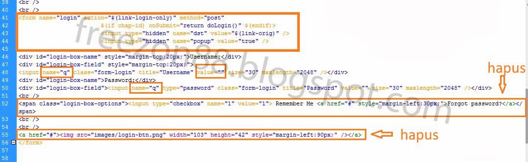 untuk input username ubah name=”q” menjadi name=”username”, masukkan value=”$(username)” begitu juga untuk input password name=”password”,ย dan hapus code yang menampilkan tombol button dan yang menampilkan checkbox remember me. kita akan membuat sendiri tombol button yang sesuai dengan form login.