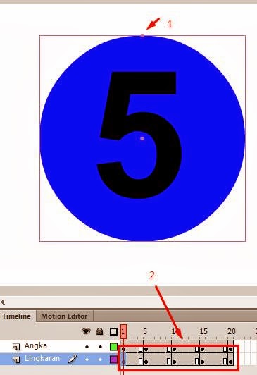 Selanjutnya Lakukan hal yang sama pada layer Lingkaran yaitu menambahkan keyframe pada frame 5, 10, 15 dan 20 dengan mengikuti panduan yang sama pada layer Angka yang telah dibahas diatas, hingga tampilannya seperti no 2 pada gambar dibawah.