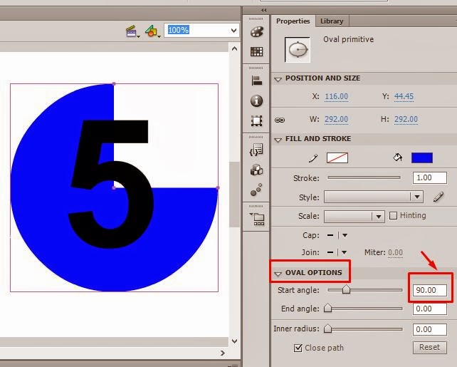 Langkah selanjutnya masih pada layer lingkaran, klik frame 5 dan klik objek lingkaran sehingga muncul menu oval option pada property yang berada disebelah kanan lembar kerja, ubah nilai dari start angel menjadi 90 sehingga seperti gambar dibawah ini