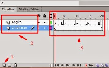 Selanjutnya kita akan membuat sebuah objek lingkaran yang berkurang ketika animasi timer tersebut di jalankan. Perhatikan gambar dibawah, pertama-tama buatlah sebuah layer baru dengan mengklik new layer (no 1 pada gambar), ubah nama layer menjadi Lingkaran dan tempatkan dibawah layer Angka dengan cara klik tahan dan geser kebawah (no 2 pada gambar).
