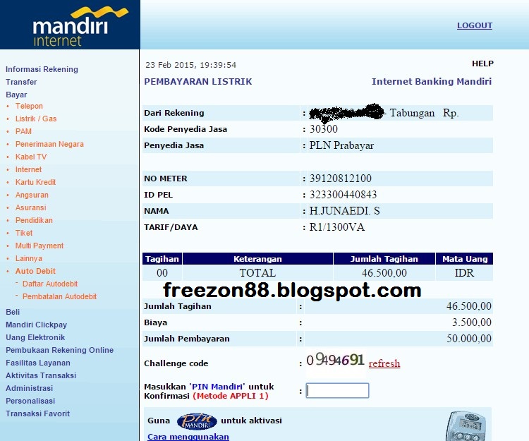 Cara mudah beli voucer/pulsa listrik prabayar dengan Internet banking mandiri. Bagi pengguna internet banking banyak kelebihan-kelebihan yang ditawarkan. Salah satunya adalah dengan pembelian voucer listrik pln prabayar.Sebenarnya saya sudah lama menggunakan fasilitas internet banking, namun baru kemarin saya mencoba untuk melakukan pembelian voucer listrik. Caranya sangat mudah, yang perlu dipersiapkan adalah koneksi internet dan token. Nah bagi pengguna internet banking pasti sudah tidak asing lagi dengan namanya token.Oke, langsung saja berikut cara membeli voucer listrik dengan menggunakan internet banking bank mandiri.1. Login ke internet banking mandiri, perhatikan menu sebelah kiri, pilih bayar – listrik/gas, maka akan muncul tampilan seperti gambar dibawah ini:Cara pengisiannya :Dari rekening, pilih rekening tabungan anda. Penyedia layanan pilih PLN Prabayar. IDPEL/ No Meter isi dengan nomor meter listrik anda dan amount isi dengan jumlah pulsa listrik yang akan anda beli. Misalnya anda ingin membeli pulsa listrik 50rb isi dengan 50.000. setelah itu klik lanjutkan.2. Selanjutnya perhatikan tampilan layar berikutGambar diatas adalah keterangan dari nama dan ID PEL yang tadi anda masukkan dan keterangan jumlah tagihan. Untuk melanjutkan centang/ceklis disamping kolom Mata Uang untuk menyetujui pembayaran dan klik lanjutkan.3. Konfirmasi pembayaran dengan menggunakan tokenUntuk ini anda harus menggunakan token. Hal ini agar pembayaran voucer listrik bisa diselesaikan. Untuk penggunaan token pasti pengguna internet banking sudah mengetahuinya. Karena pada saat pengajuan internet banking, sudah diajarkan cara penggunaan token.4. Transaksi pembelian pulsa listrik elektrik berhasilJika anda sudah memasukkan kode konfirmasi dari token, klik lanjutkan untuk mengakhiri pembayaran. Setelah itu maka akan muncul tampilan seperti gambar diatas yang mengatakan pembayaran anda telah berhasil. Pada gambar diatas juga sudah tersedia token yang langsung dapat anda isikan di meteran listrik prabayar. Selamat mencoba. -