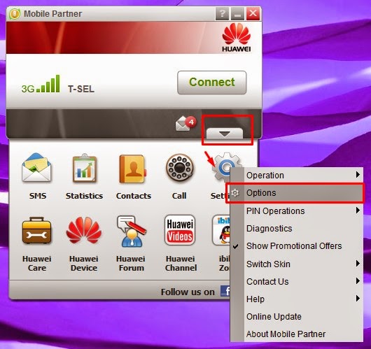 Jika selesai instal aplikasi tersebut, jalankan aplikasi modem yang akan tampak seperti gambar diatas. Klik tanda panah kebawah seperti gambar diatas, lalu klik setting dan pilih options.