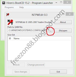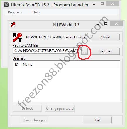 klik open file seperti yang dilingkari merah pada gambar diatas, kemudian cari file SAM yang terdapat pada C:WINDOWSSYSTEM32CONFIGSAM, setelah membuka file SAM makan akan muncul user-user yang terdaftar pada windows tersebut, termaksud juga administrator. klik user yang ingin dirubah passwordnya kemudian pilih change dan save change. restart komputer dan masuk menggunakan password yang telah diganti