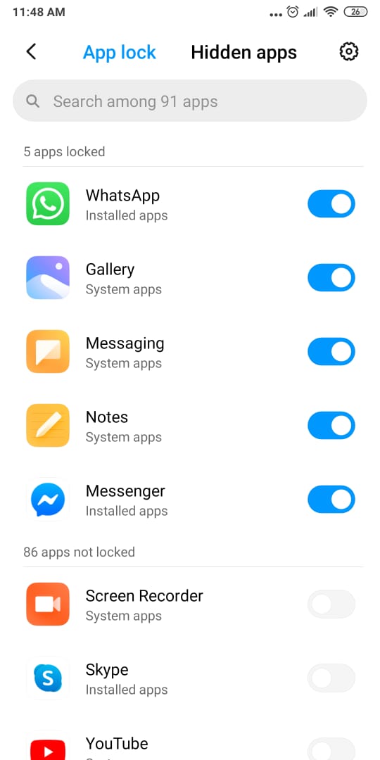 3. Selanjutnya pilih dan aktifkan aplikasi apa saja yang akan di lock. Contoh dibawah ini saya mengaktifkan app lock pada aplikasi Whatsapp, Gallery, Messaging, Notes dan Messenger.
