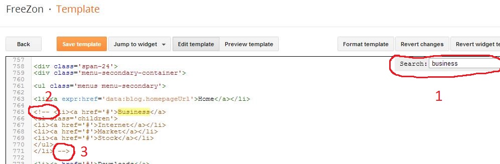 pada gambar disamping terdapat menu bawaan template yang saya gunakanan. namun saya ingin menghapus sebagian menu yang tidak sesuai dengan blog saya.pertama-tama masuk pada blogger dan pilih menu template lalu klik edit html seperti gambar dibawah inikemudian tekan Ctrl + F untuk mengaktifkan search pada file xml, masukkan nama menu yang ingin dihapus atau dirubah, dibawah ini saya ingin menghilangkan menu business pada menu template sayauntuk menghilangkannya dapat dengan menghapus menu business yang ditandai pada angka 2 sampai angka 3, tapi contoh diatas saya hanya menambahkan code <!– pada awal code menu business dan –> pada akhir code, fungsinya yaitu agar kode li pada menu business hanya terbaca sebagai comment di browser sehingga tidak tampil pada browser.Baca Juga : Cara Mengetahui Keyword Pengunjung Blogsedangkan untuk merubah menu tersebut, cukup dengan merubah kata business sesuai dengan menu yang diinginkan namun jangan lupa untuk memasukkan alamat url menu baru dengan cara memasukkan link menu pada href=’masukkan-link-menu-disini’.Untuk membuat menu di blog dengan menggunakan fungsi page atau halaman dapat mengikuti panduan Cara Membuat Menu di Blognah sampai disini kita sudah dapat merubah menu template yang kita download sesuai dengan keinginan 🙂 semoga membantu -