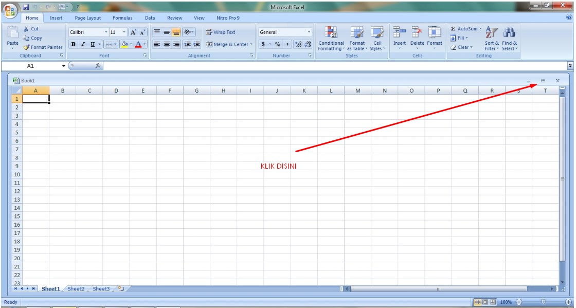 Opsi ketiga yang saya lakukan adalah membuka lembar kosong Ms Excel dan KLIK TOMBOL MAXIMIZE pada jendela sheet, seperti contoh dibawah ini
