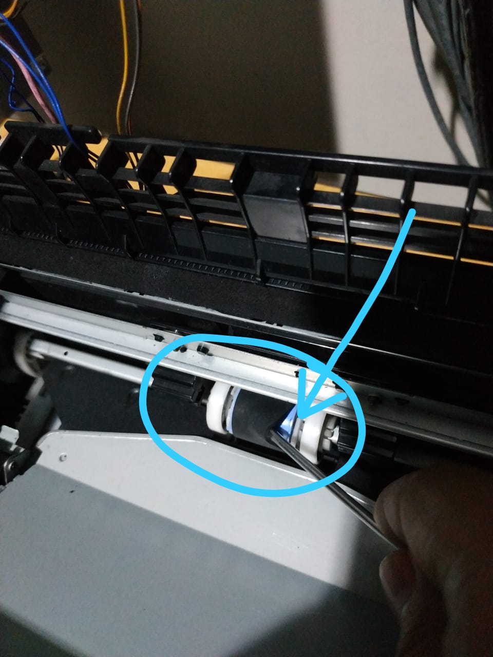Bagi kalian yang mau mencobanya, cobala selipkan kertas didalam karet pickup roller seperti contoh dibawah ini