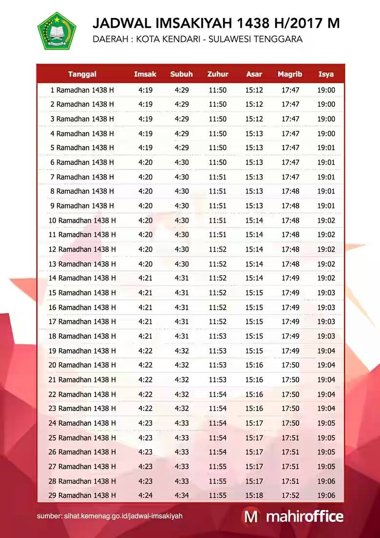 Marhaban ya Ramadhan untuk teman-teman area kendari, dibawah ini adalah jadwal imsakiyah untuk dijadikan panduan saat melaksanakan ibadah puasa dibulan ramadhan. Untuk file yang berbentuk Excel dapat anda dapatkan dengan klik Disini