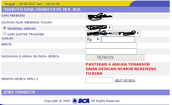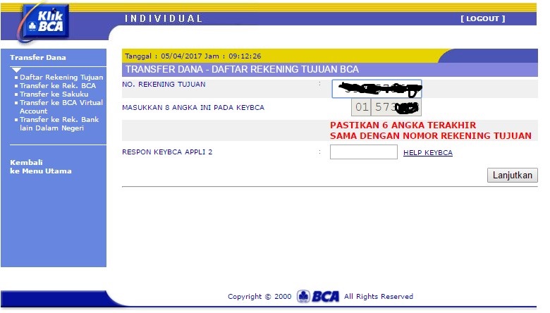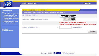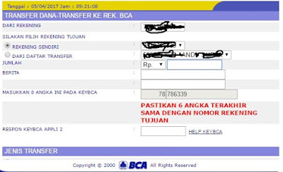 4. Masuk ke Menu Transfer ke Rekening BCA Silahkan pilih rekening tujuan Dari Daftar Transfer, masukkan jumlah nominal uang yang akan ditransfer dan masukkan 8 angka kedalam KeyBCA (Token BCA) dengan pilihan APPLI 2 maka akan muncul angka baru pada KeyBCA tersebut lalu masukkan kedalam Respon KeyBCA APPLI 2. Dan klik lanjutkan.