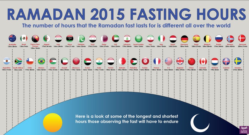 Di Indonesia umat muslim menjalankan ibadah puasa selama kurang lebih 13 jam. Tapi tahukah anda bahwa dibeberapa Negara di dunia, memiliki durasi waktu berpuasa yang berbeda-beda. Bahkan di islandia bisa sampai 22 jam lamanya.