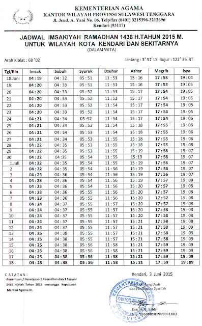 Download Jadwal Imsakiyah / Buka Puasa Harian Kendari Sulawesi Tenggara 1436 H 2015. Jadual Buka Puasa Daerah Kendari Sulawesi Tenggara 1346 H / 2015 M. Marhaban ya Ramadhan. Menjelang masuknya bulan ramadhan umat muslim akan bersiap untuk melakukan ibadah puasa. Diseluruh dunia ibadah puasa sangat ditunggu-tunggu umat muslim untuk memperbanyak pahala dibulan yang suci ini.