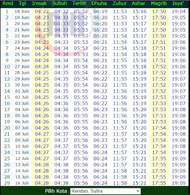 Agar puasa berjalan lancar dan terkendali, sebaiknya kita mengetahui jadwal buka puasa dan imsakiyah. Nah pada kesempatan kali ini saya akan share jadwal buka puasa untuk daerah kendari dan sekitarnya. Jadwal ini ada dua versi yaitu dari situs kementrian agama dan situs rukyatulhilal.