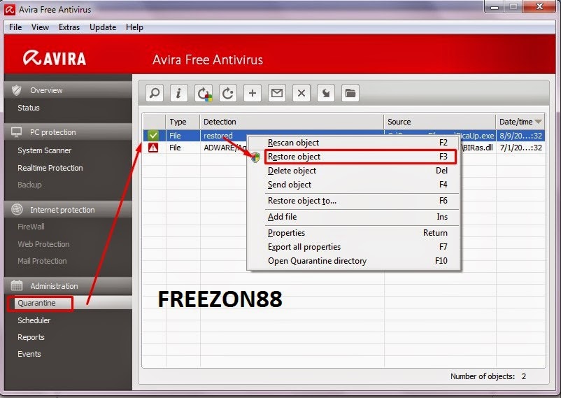 Pada contoh tampilan diatas, pada bagian menu administration pilih sub menu Quarantine. Pada tampilan sub menu Quarantine akan muncul disebelah kanan aplikasi-aplikasi yang di karantina oleh avira. Untuk mengembalikannya klik kanan pada aplikasi tersebut dan pilih restore object. Aplikasi yang telah berhasil di kembalikan akan berwarna tanda centang hijau dan detectionnya berstatuskan restored.